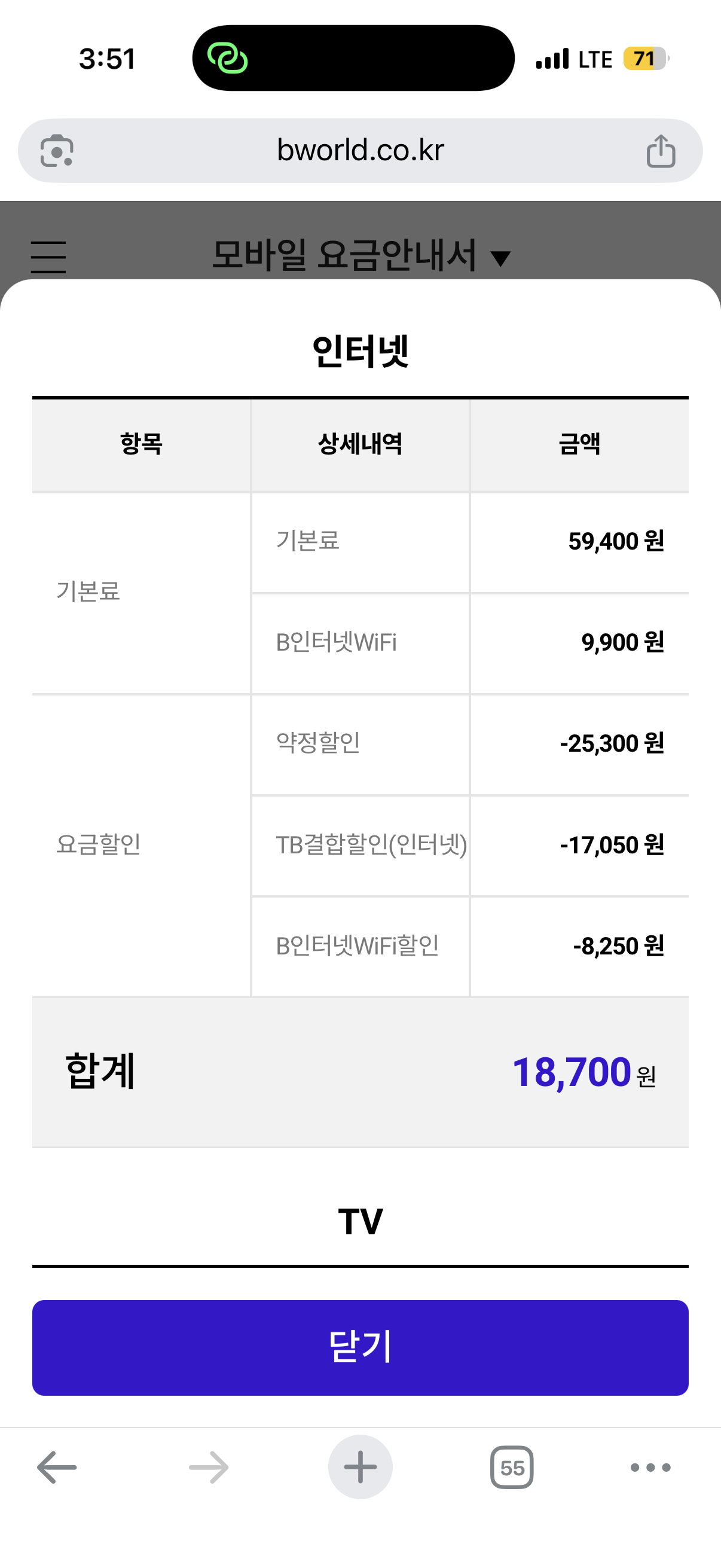 질문2) 1번이 맞다면 인터넷 요금은 50% 할인을 받고 계신지 궁금합니다🙋♀️