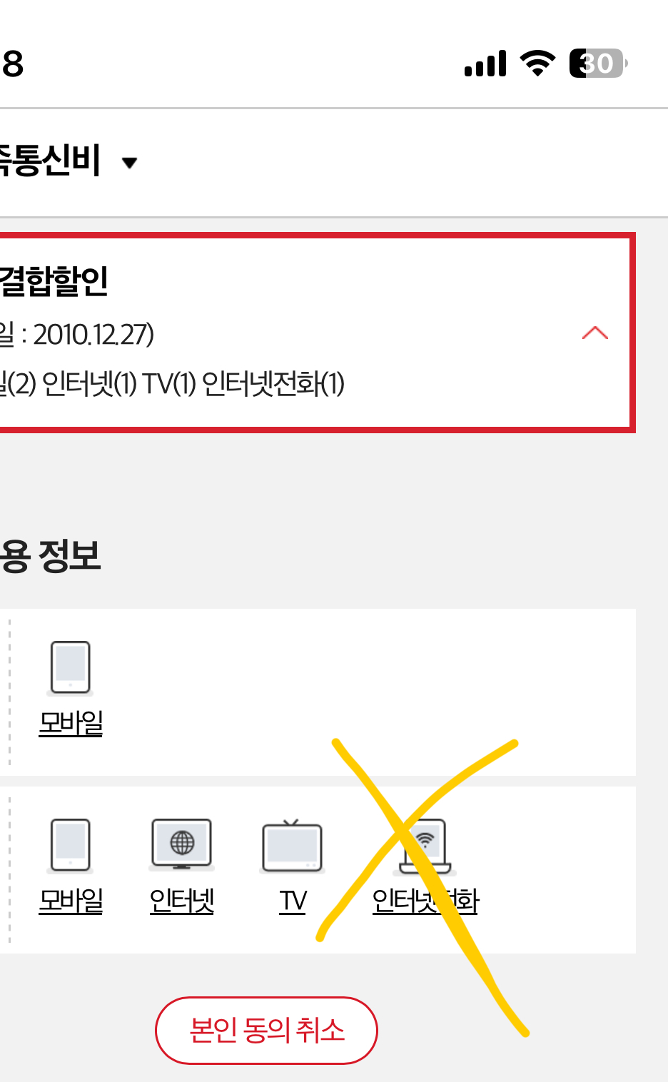 1. 본가 결합상품 : 총액결합할인(모바일2+인터넷1+인터넷전화 - 전화만 4/28해지신청완료)