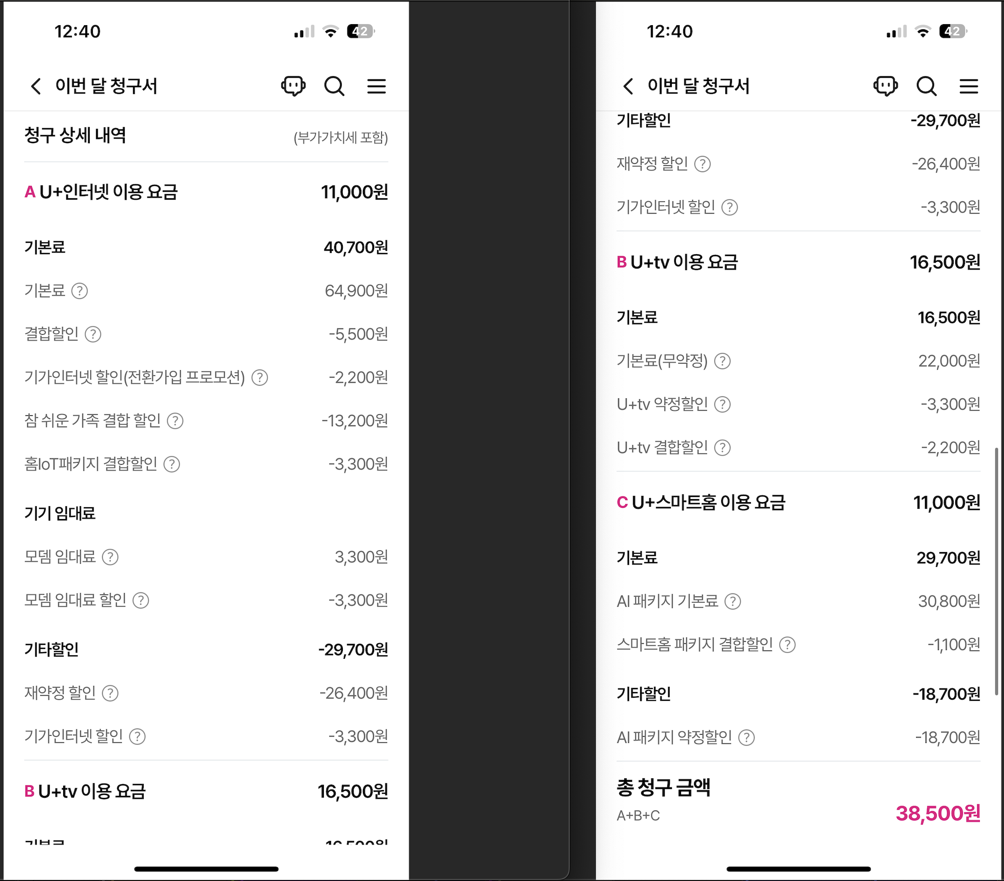 - 1기가 + 공유기 + 티비 + 맘카 = 38,500원이고,