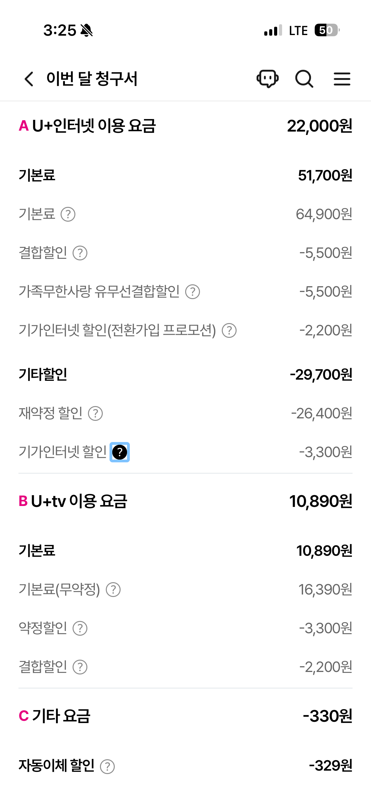 월 32890원이었는데 3300원 할인이 빠져서 이번 약정부터 36,140원으로 청구된다고 합니다.