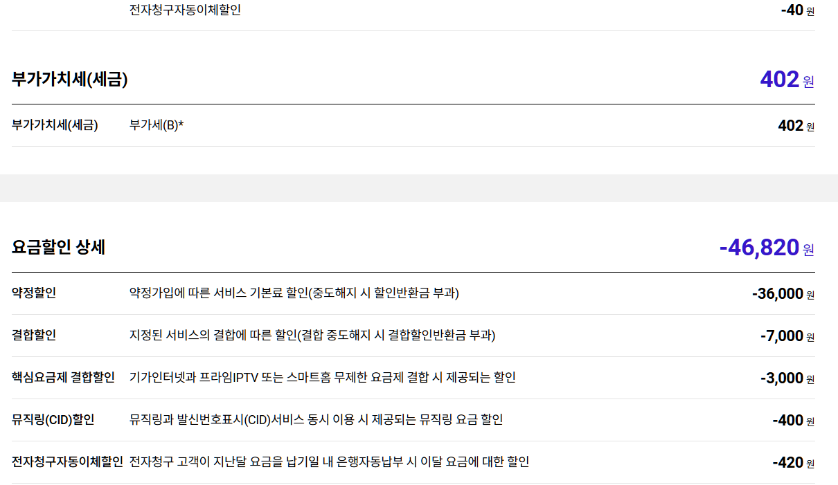 그리고 정확하게 잘 모르겠는데 5,500원 할인은 싱글?로하면 들어가고 결합하면 저희가족이랑 결합하면 할인이 안들어간다고 얘기한것같아요..