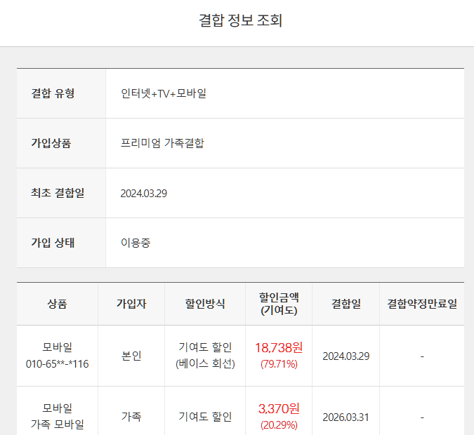 🏠처가 : SK 인터넷 + IPTV = 이용중 / 약정 만료(?) / SK 휴대폰 2회선과 결합 중이신 듯(?)