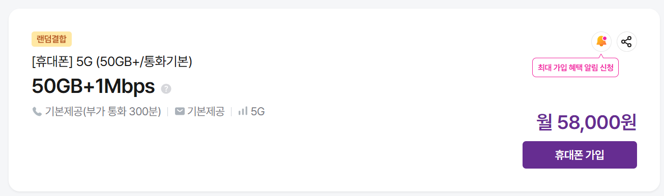 결합 가능한 요금제는 [랜덤결합] 옆에 인터넷 결합 가능 여부도 함께 표기되어 있답니다🙋♀️