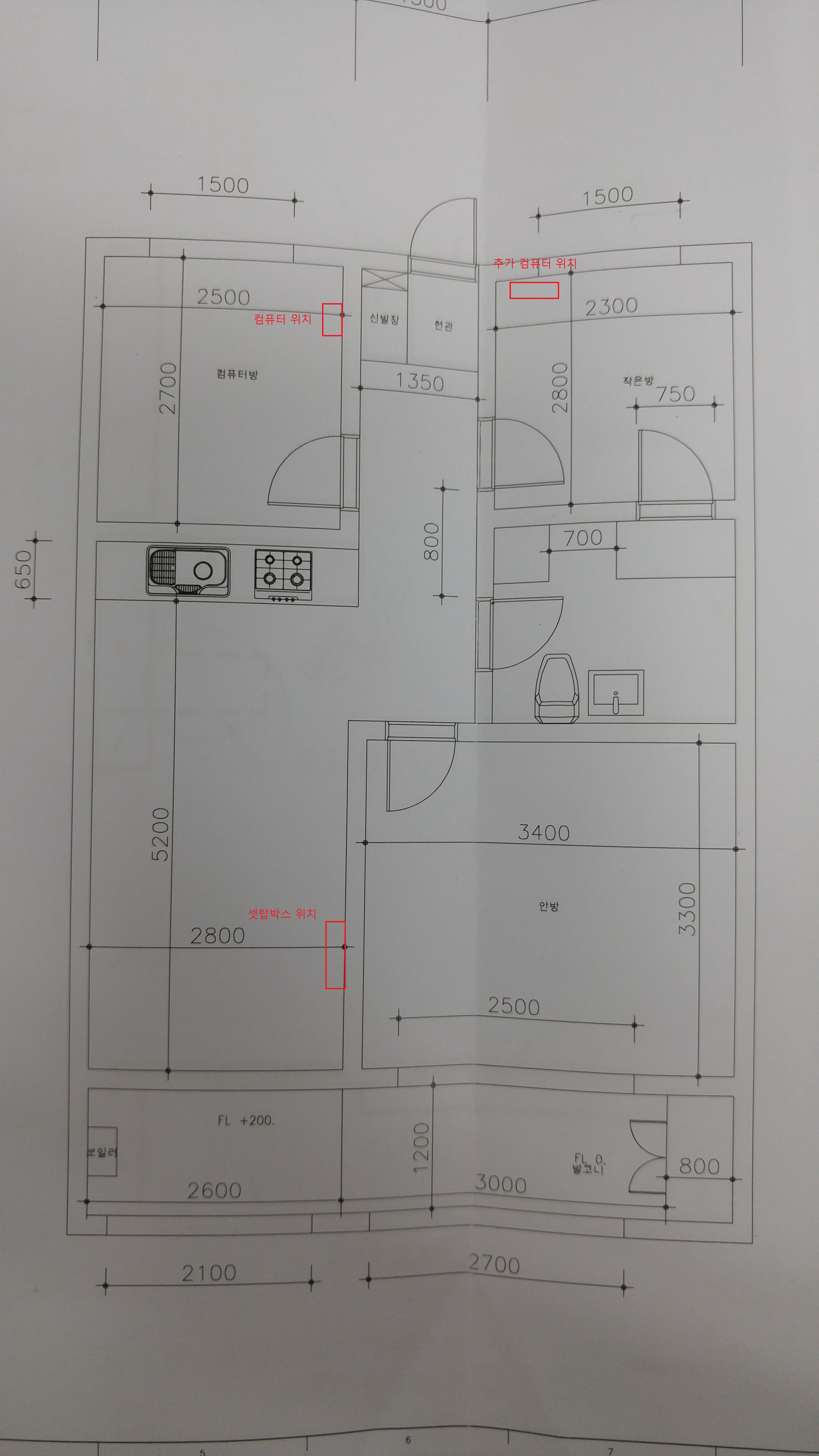 집안 평면도에 셋탑박스 위치와 컴퓨터 설치위치 및 추가 컴퓨터 설치위치를 표기하였습니다.