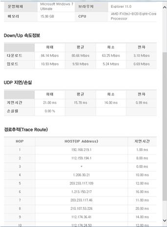 캡쳐해주신 지연시간 기록과 업 / 다운로드 속도를 보니,