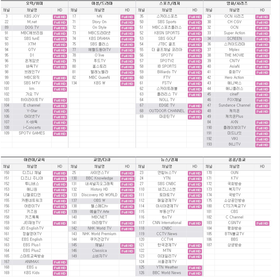 - 23개 프리미엄 채널이 추가된 총 152개 채널이 지원되며, 마찬가지로 위 링크에서