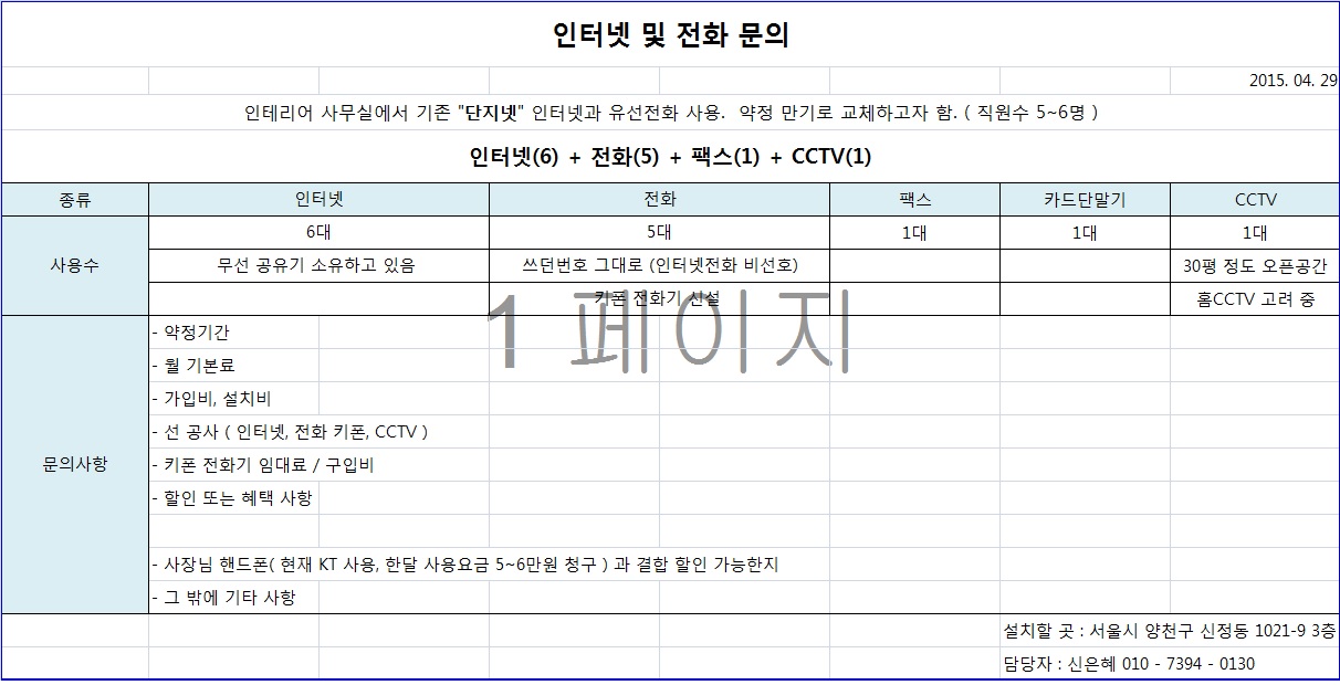 인테리어 사무실에서 기존 "단지넷" 인터넷과 유선전화 사용. 약정 만기로 교체하고자 함. ( 직원수 5~6명 )