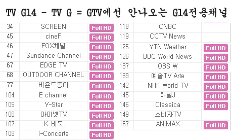 여기 GTV에서 나오지 않는, GTV14만의 채널표를 첨부해드릴께요!