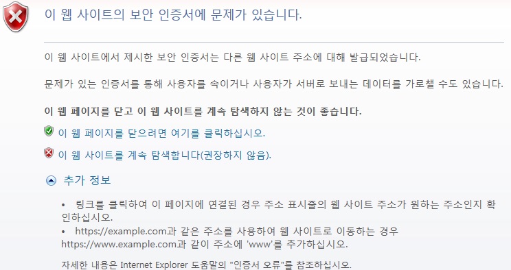 신뢰사이트로 저장을 해도 인증서 오류 때문에 등록이 안됩니다. 해결방법이 있을까요?