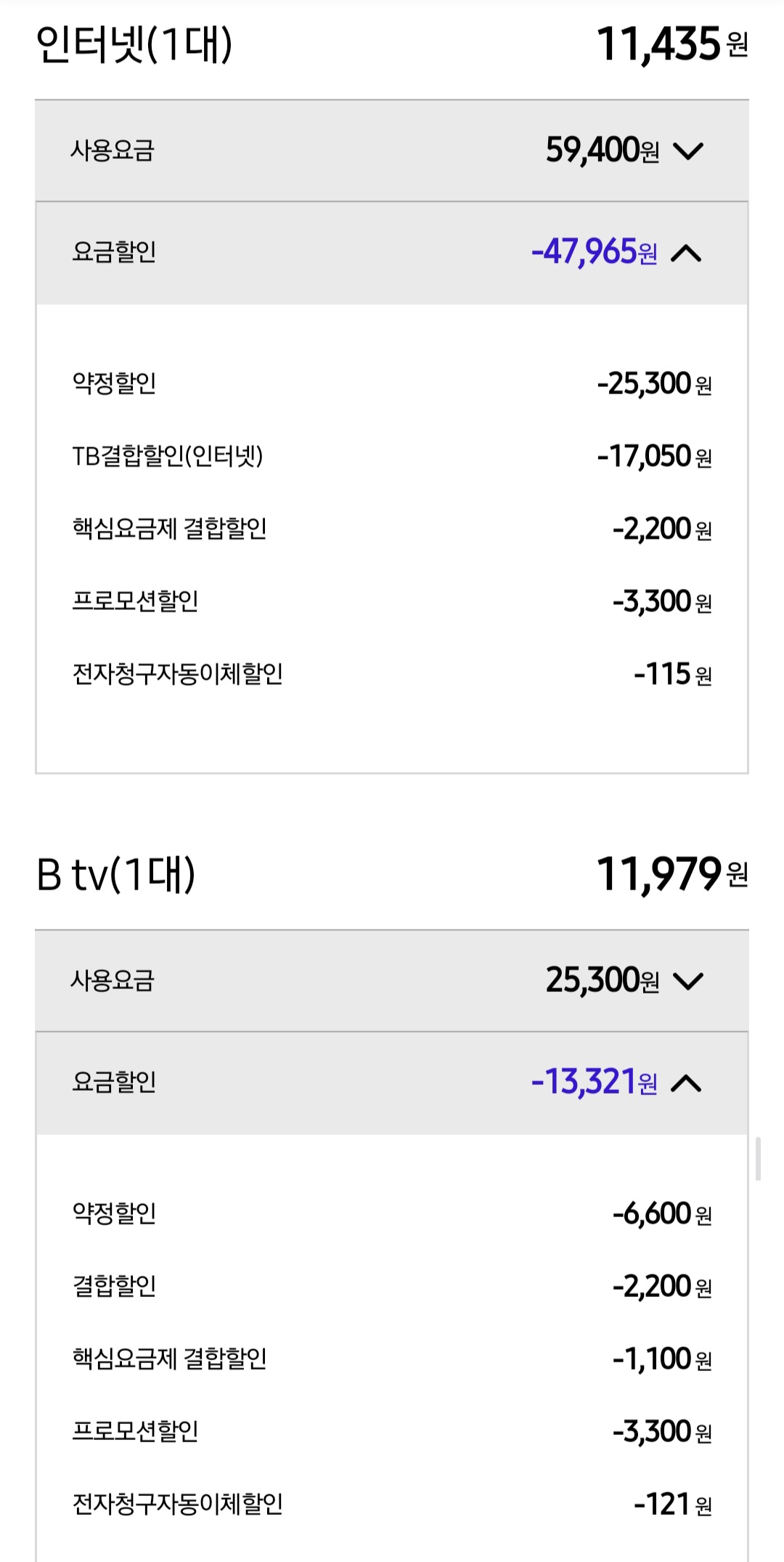 현재 온가족할인 30년 이상 구간으로 인터넷 50% / 휴대폰 30% 할인 받고 계시겠어요~ 👍