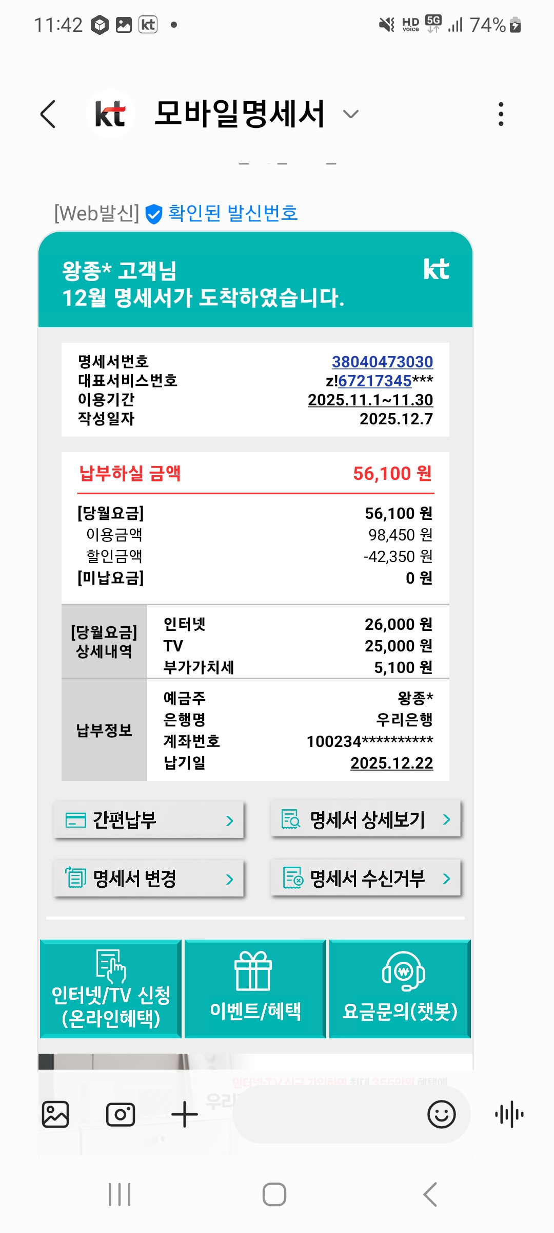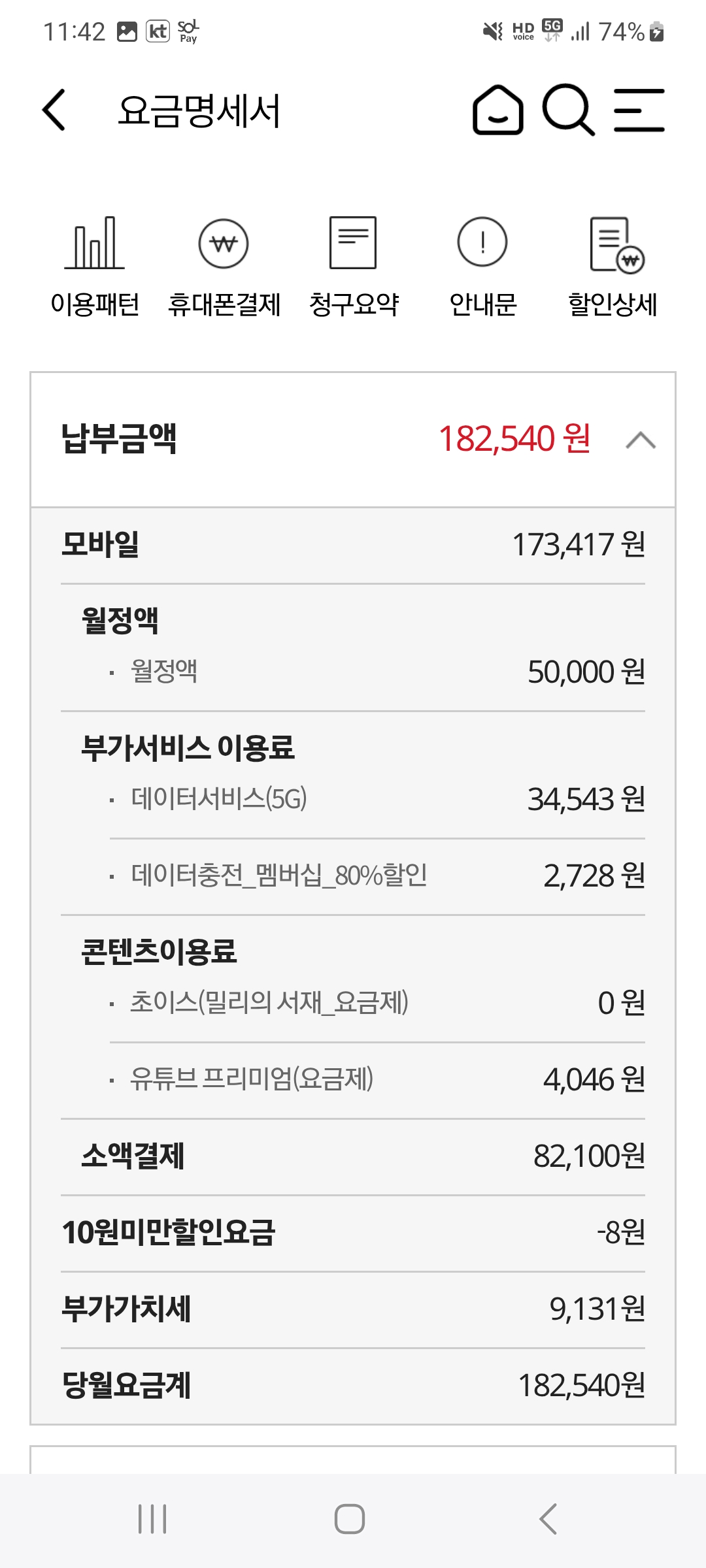 폰 요금은 테더링이 모자라서 데이터추가와 소액결제를 몇건하는 바람에 11만원정도 오버됐구요