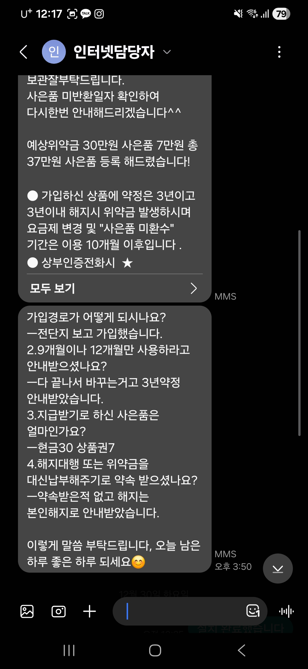 어제 갑자기 전화로 지금 쓰시는 인터넷 10개월 정도 되신거 같은데 단통법이 개정되어 10개월만 쓰면 사은품반환없이 변경 가능하고 10개월 마다 바꿀 수 있고 해지 위약금은 전액 자기들이 지원해주겠다며 연락이 왔습니다. 듣다 보니까 손해볼거 없을거 같아서 알겠다고 하고 sk로 바꿔주고 상품권 7만원에 자기들이 견적짜보니 위약금이 30만원정도 나오는데 30만원 지원해주겠다 라고 해서 설치 일정을 1월달로 했더니 달이 넘어가면 혜택이 변경될 수 있으니 12월달로 하는게 좋다해서 아무 생각없이 오늘 오전에 설치해달라해서 설치 기사님이 다녀가시고 전화 했더니 설치 완료되었으면 직접 전화해서 인터넷 해지를 해주셔야 한다고 해서 lg에 전화해서 해지한다 했더니 위약금이 30만원이 아니라 80만원이 나온다고 하여 다시 전화했더니 통신사 방어 전력이고 위약금 추가 발생시 추가 지원이 가능하니 300일 이상 10개월치 요금 납부가 확인되면 해지 해도 된다고 합니다. 근데 이렇게 까지 듣다보니까 뭔가 피싱 사기 당한거 같아 질문 남겨 봅니다. 혹시 사기가 맞다면 이미 sk인터넷 설치가 끝났는데 어떻게 해야 하나요?