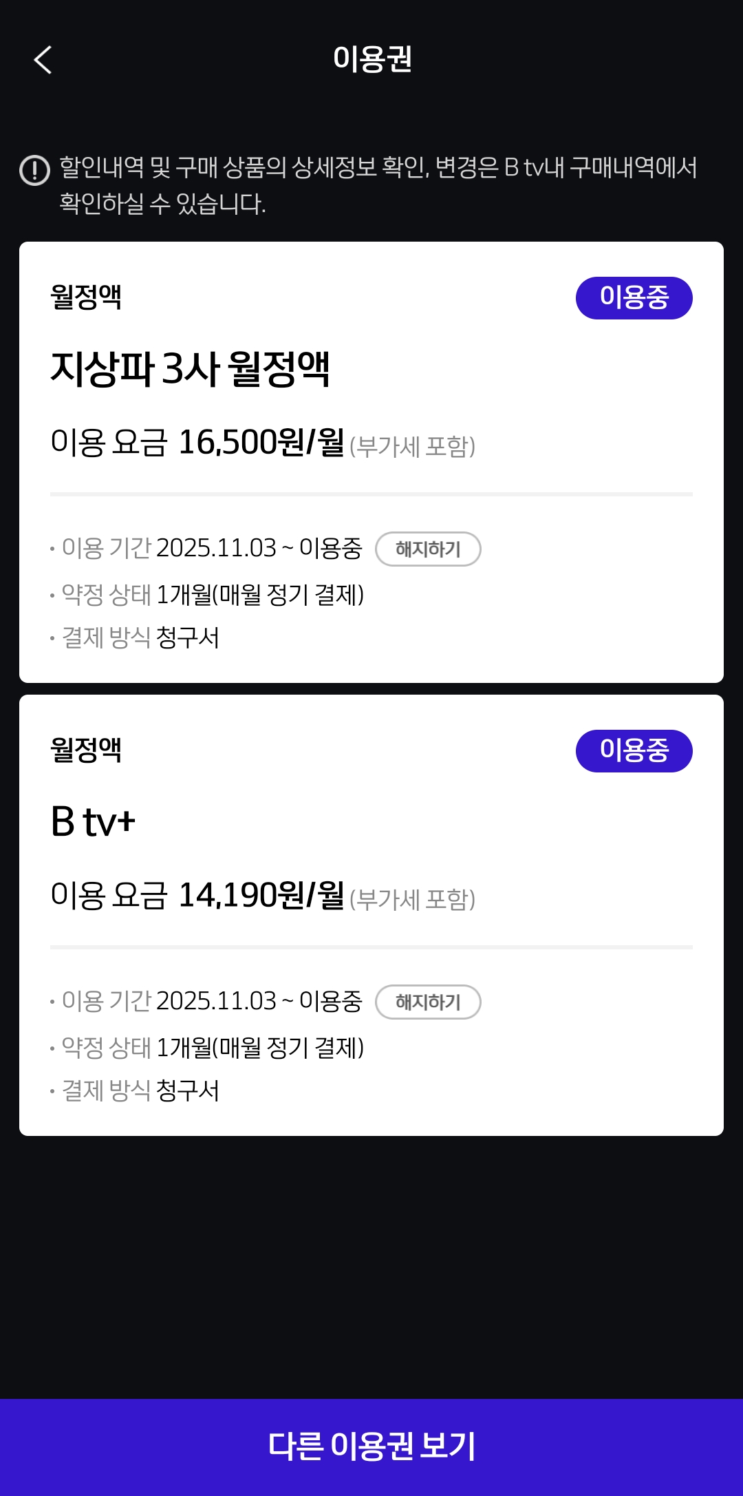 계약하면서 받은 혜택기간이 끝나면서 이용권이 구매된것 같기도 한데, 첨부한 사진에 지상파월정액, btv+ 둘다 해지해도 상관이 없나요? 아니며는 유지해야하는지요?
