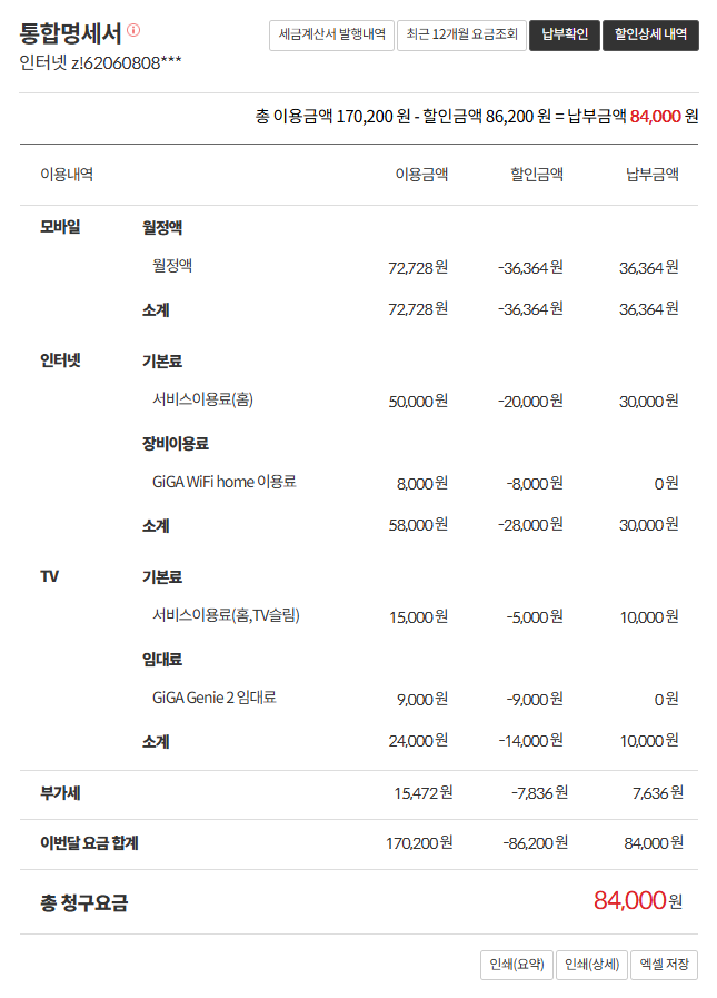 현재 이용중인 인터넷과 휴대폰, TV 총 요금입니다.
