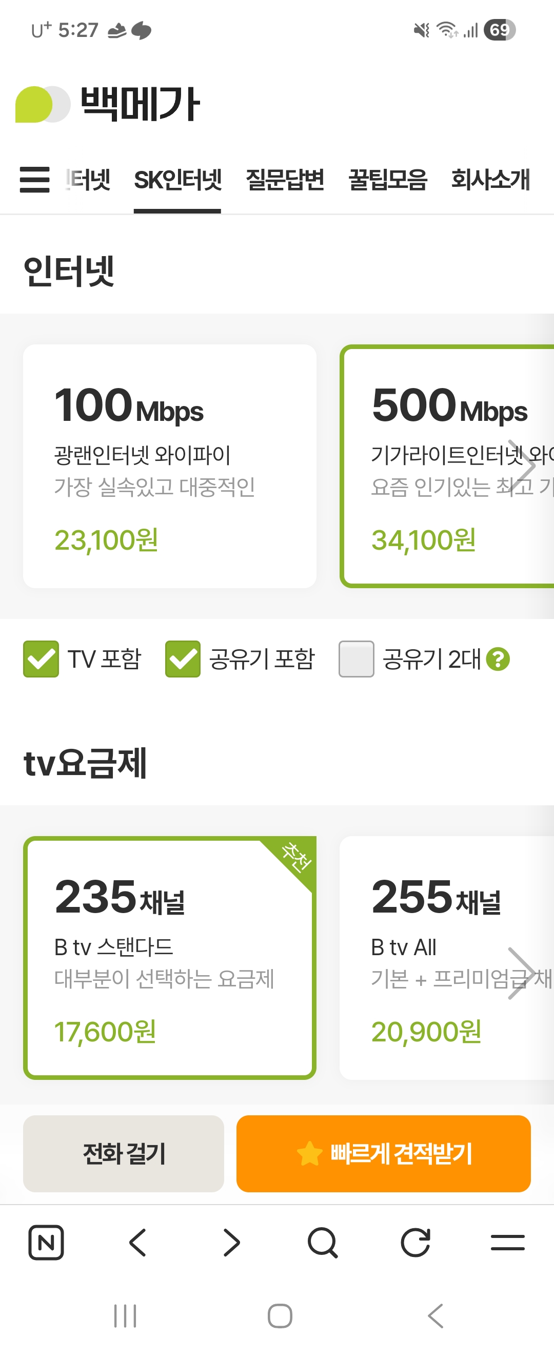 SK 500메가, 스탠다드 요금제 선택하려합니다.