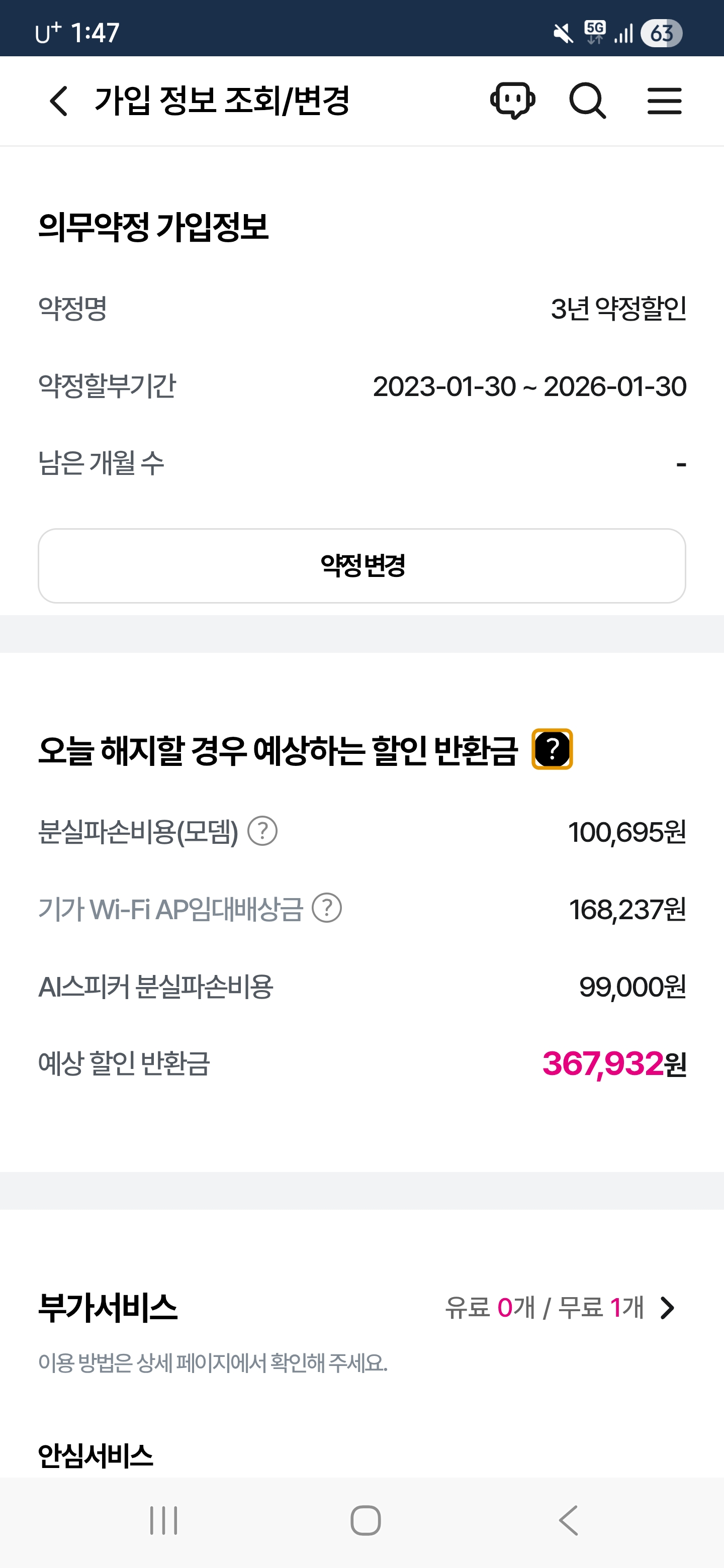 인터넷 3년 약정 기간이 1월30일로 끝나서 해지하려는데 할인반환금은 뭔가요?