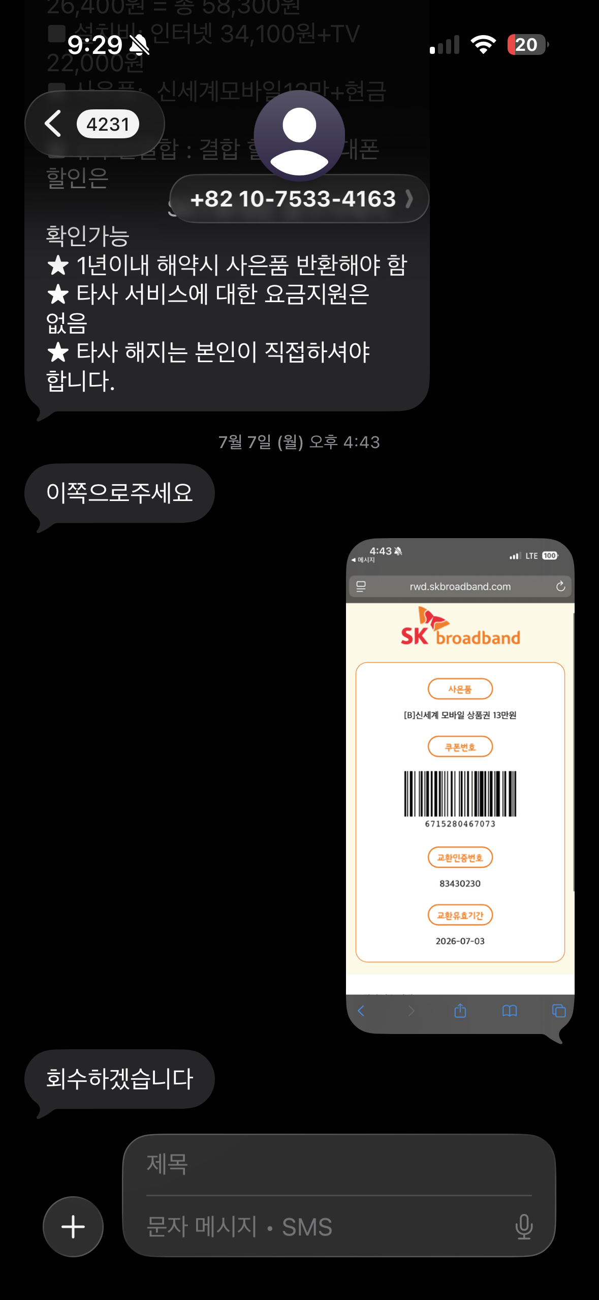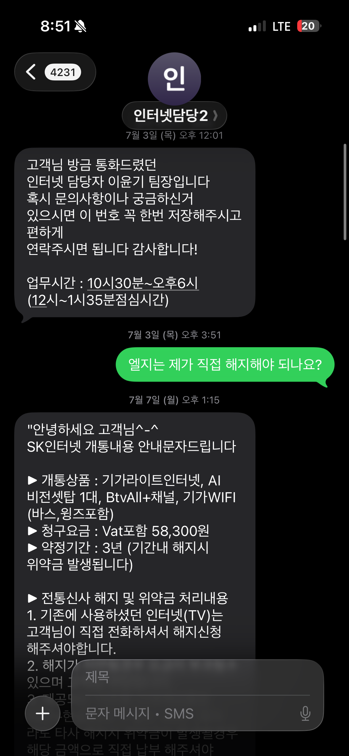 4. 이러는 와중에 새로운 사람에게 전화가 와서 1년이 아직 안됐지만 옮기면 된다고 전화가 왔습니다. 근데 대화를 하다 보니 같은 직원이 아닌 것 같습니다. 계속 이전 담당자와의 녹취나 문자를 요구하더라구요. 그 이전 담당자는 핸드폰으로 전화하니까 없는 번호로 나오고요...그리고 생각해보니 현재 sk를 해약하면 70만원이 넘게 위약금이 나오는데 거기에 지금 제가 못받았던 60만원을 받는게 말도 안되는 것 같고 사기인지 아닌지 아직 분간이 안갑니다. 오늘 지원금액 전화와서 알려준다고 했습니다