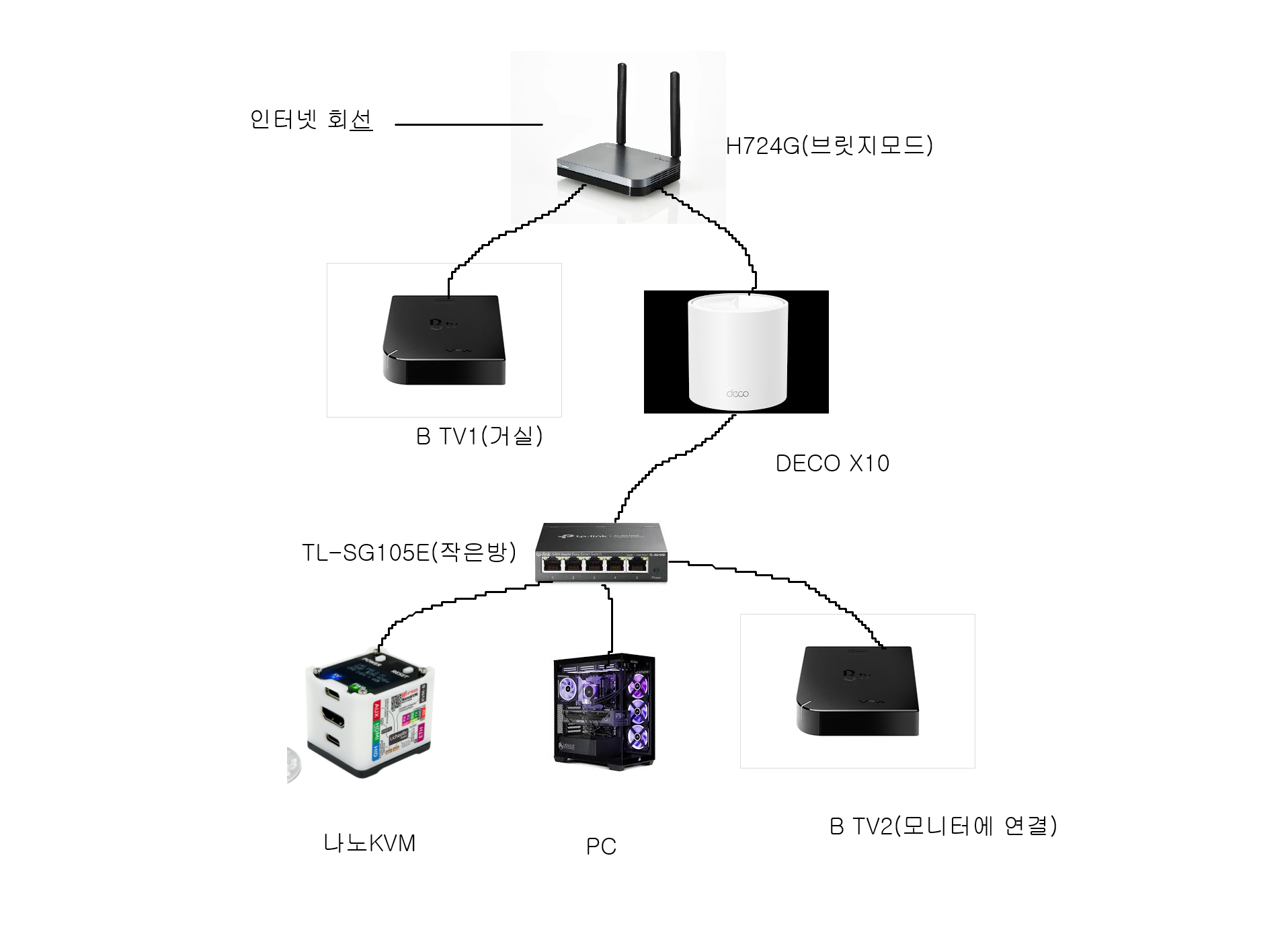 PC와 KVM을 다시 사설아이피로 돌리고 B TV도 가능하게 하려면 어찌해야할까요..? 아님 같은 데코 X10을 사서 아래와 같이 연결해야 할까요..?(두번째 데코는 안방 아니면 통신사 공유기 반대쪽에 꼽는 곳이 또 있어서 거기에)