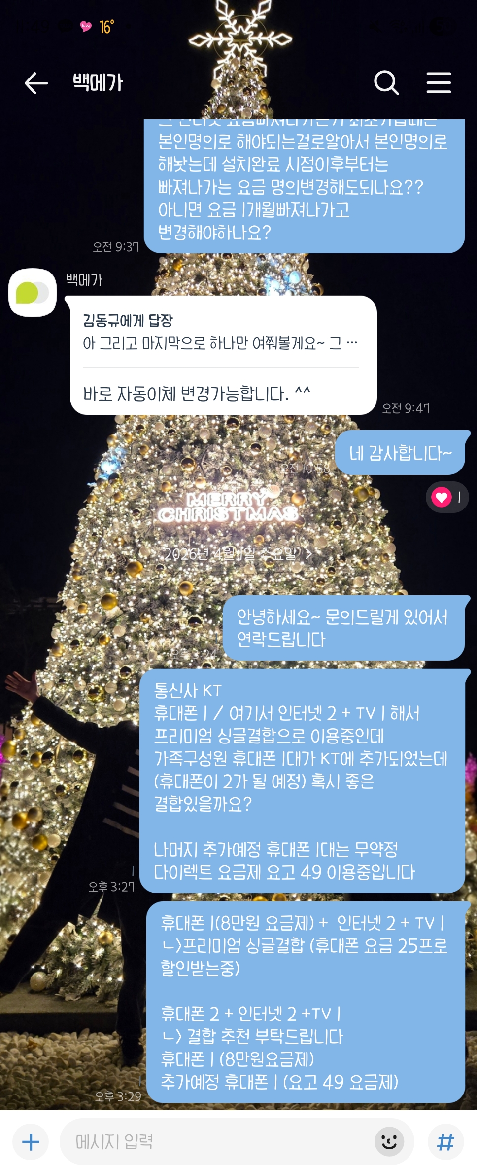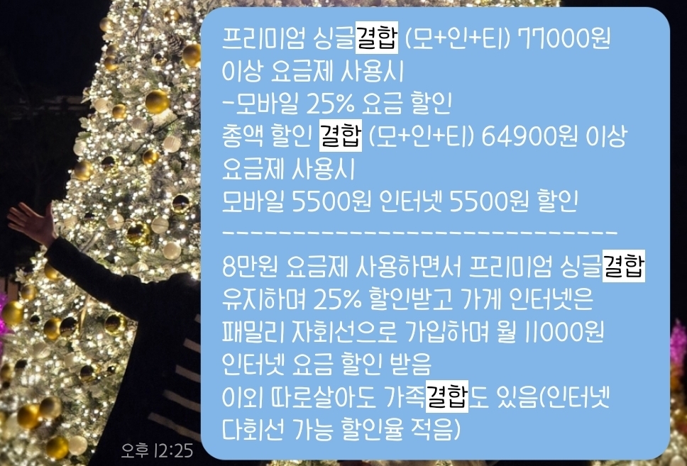 안녕하세요. 위 카톡메시지 참고하여 KT 휴대폰 1 + 인터넷 2를 프리미엄 싱글 결합으로 이용하고있는 사람입니다.