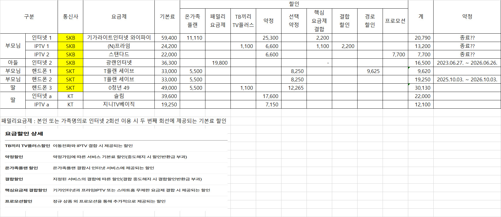 그리고 구체적인 가입 현황 및 통신사, 비용, 결합할인 내역은 아래 이미지와 같습니다. (노란색 칸은 결합이 되어있는 기기 현황입니다)