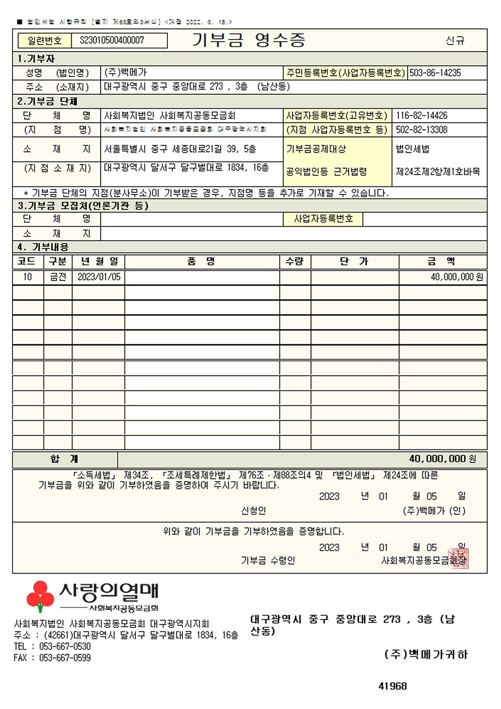 이러한 이해 충돌을 피하기 위해 : 백메가는 몇 년간 기부 사실을 대외적으로 알리지 않고, 회사 임원들의 자발적 급여 삭감으로 기부금을 마련해 왔습니다. 하지만 기부 문화를 널리 알리는 것이 기부 이상으로 중요하다 믿습니다. 무엇보다 많은 이들의 도움으로 백메가가 존재한다는 사실에 대해, 임직원 모두의 공감대가 형성되어야 합니다.